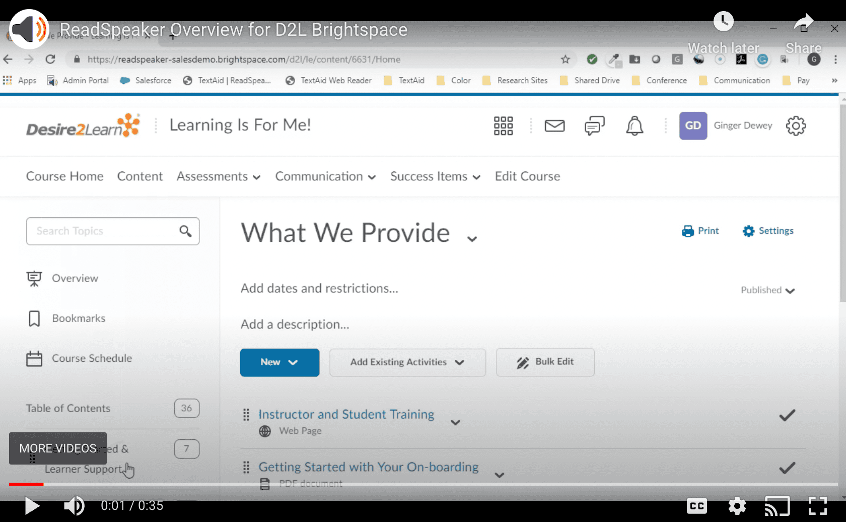 ReadSpeaker for Brightspace can be integrated across the Brightspace platform, or on a course-by-course basis. The ReadSpeaker integration features both the webReader and docReader products that can read aloud HTML content while seeing highlights of the spoken text in a variety of online document formats.